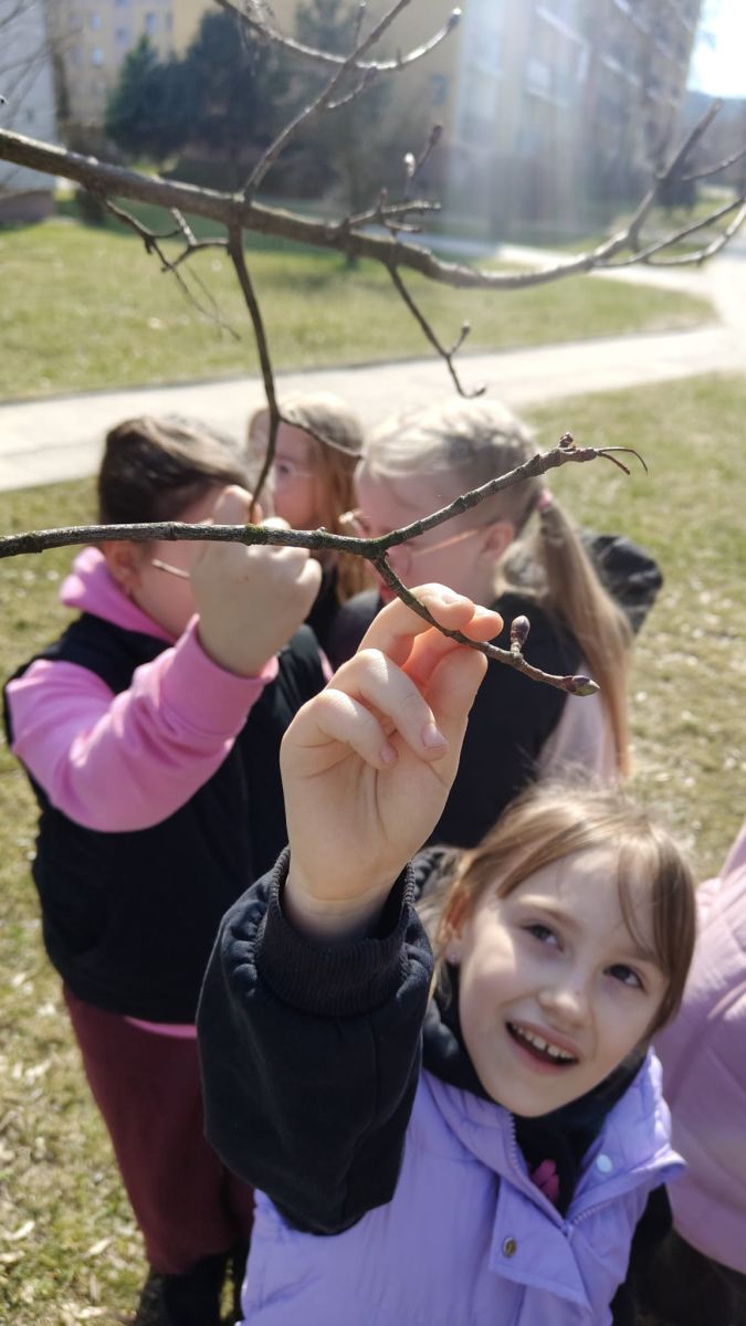 pacer klasy 2D odbył się w pogodny, wczesnowiosenny dzień☀️. Uczniowie wyruszyli w okolice szkoły, aby poszukiwać pierwszych oznak budzącej się do życia przyrody. Już na początku zwrócili uwagę na drzewa i krzewy, na których pojawiły się drobne, jasnozielone pąki- znak, że rośliny zaczynają nowy cykl wegetacyjny. Dzieci z ciekawością oglądały gałązki, porównując wielkość i kształt pąków różnych gatunków.