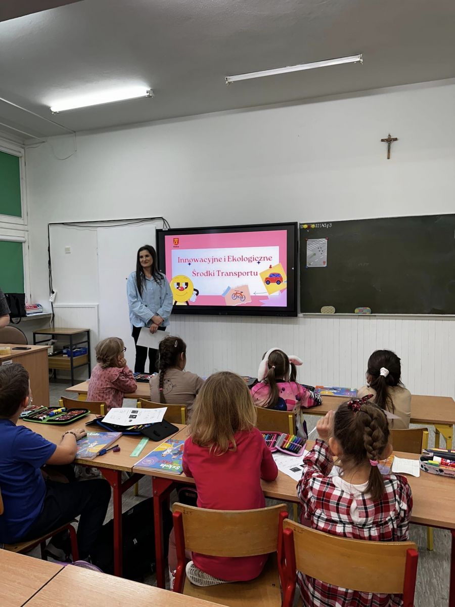Uczniowie wzięli udział w kampanii informacyjno – edukacyjnej dotyczącej niskoemisyjnego transportu pod hasłem „Innowacyjne i ekologiczne środki transportu”. Zadanie, które uczniowie wykonali w ramach tej kampanii to udział w warsztatach pod hasłem „nasz klimat na szóstkę”. Rozmawiali na temat sposobów przemieszczania się ludzi dawniej i dziś. Zastanawiali się nad tym co to jest zanieczyszczenie powietrza, jakie są jego przyczyny. Dowiedzieli się jakie ekologiczne ,środki przemieszczania się powinniśmy wybrać, aby zmniejszyć zanieczyszczenie powietrza. Na zakończenie wykonali prace plastyczne – rysunki ekologicznych środków transportu.