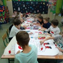 Czas oczekiwania na gościa dzieci spędziły niezwykle aktywnie. Już od godz. 18 w piątek malowały portrety Mikołaja, samodzielnie wykonały sałatkę jarzynową, którą ze smakiem zjadły na kolację. Była też bitwa kulami papierowymi - dziewczynki kontra chłopcy, słuchanie legendy o Św. Mikołaju, piosenki i wiersze. Tuż po godz. 22 cała grupa wyruszyła z latarkami na poszukiwania oczekiwanego Gościa. Idąc po tropach szkolnymi korytarzami, uczniowie mieli do wykonania różnorodne zadania. Udało się odszukać Mikołaja, który miał dla każdego dziecka piękne upominki. Radość ze spotkania była ogromna! W odwiedziny do dzieci przyszły również p. dyrektor, Marzena Stempniak i p. wicedyrektor, Marzena Ciułkowicz.