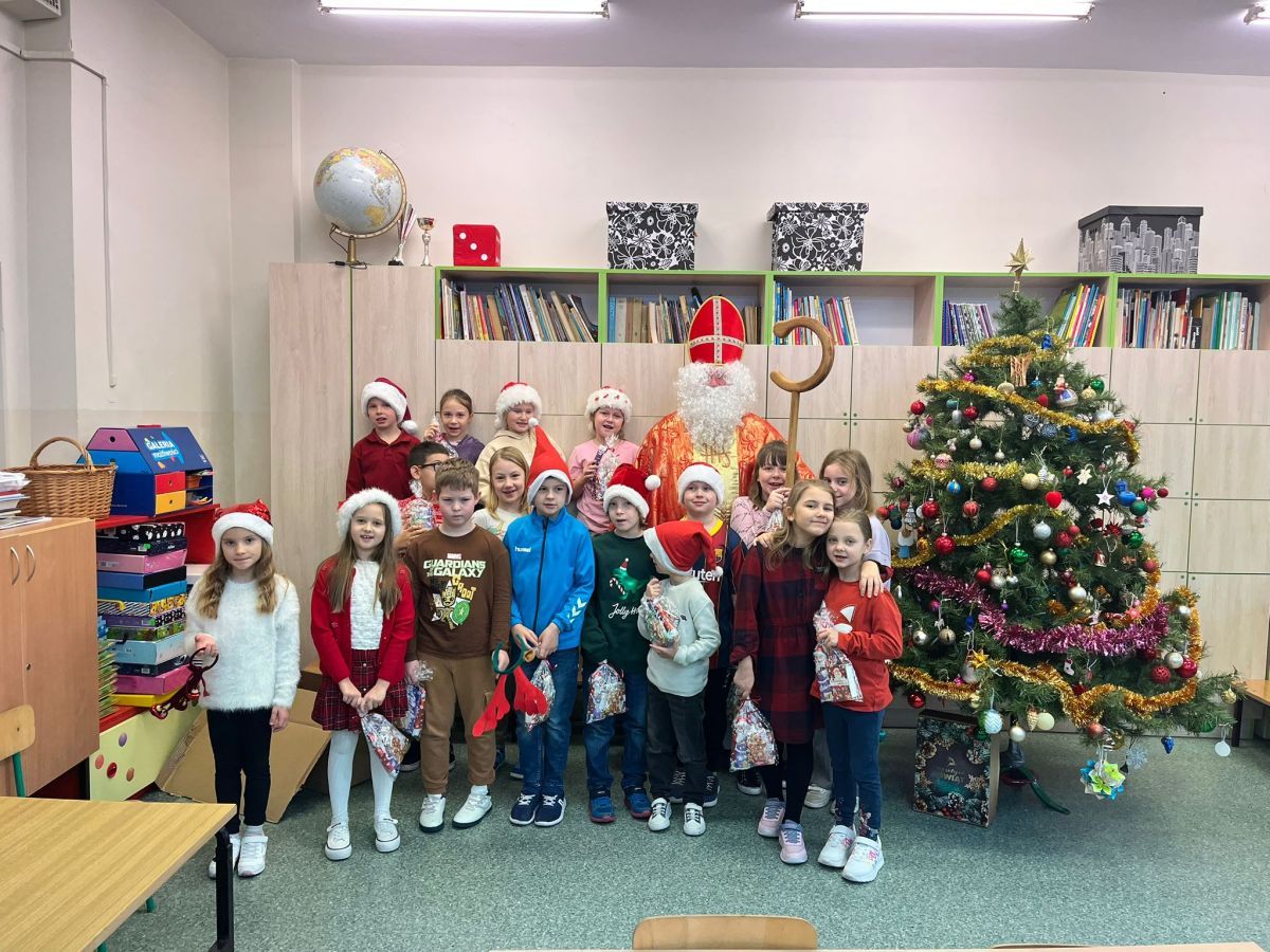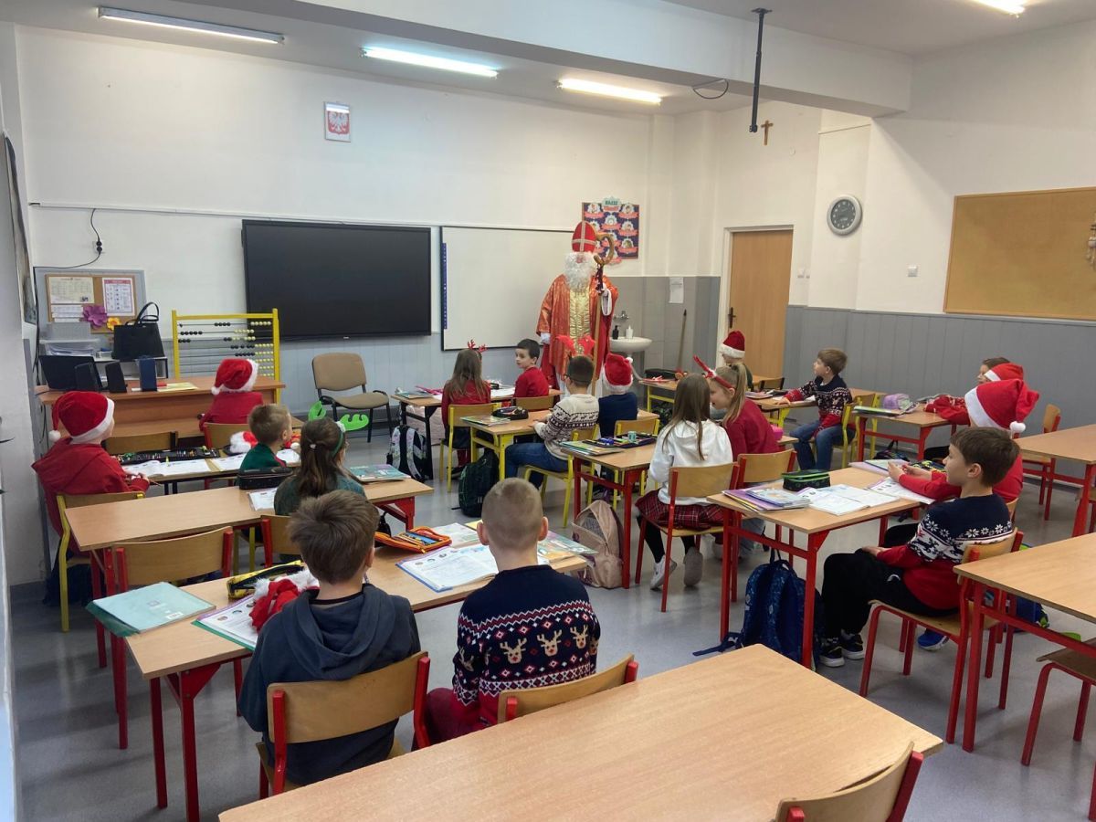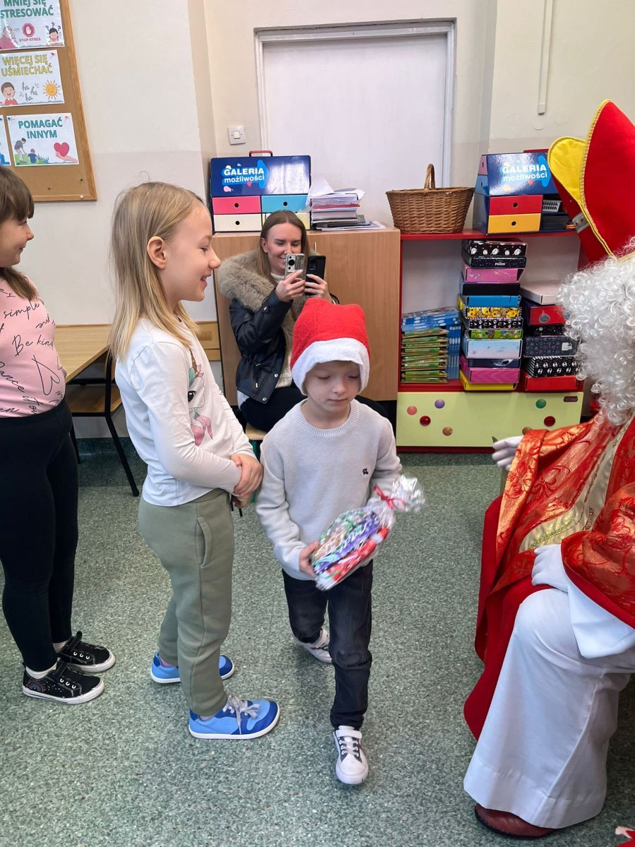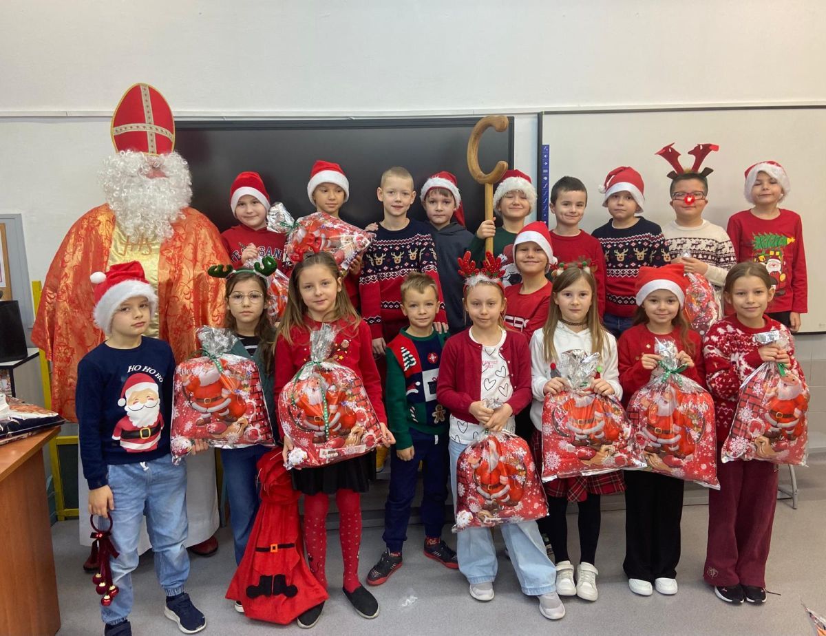 5 grudnia do szkoły przybył Święty Mikołaj. 🎅🏻 Odwiedził uczniów klas 2a i 2c. Dzieci zostały obdarowane upominkami. Na zakończenie wizyty wszyscy zrobili pamiątkowe zdjęcie.